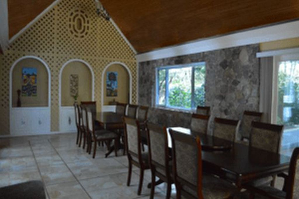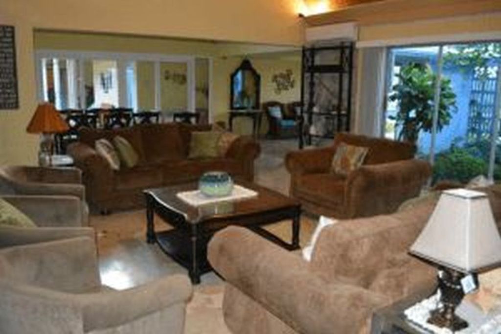 As you walk through the double front doors of Seven Palms Villa, you will be standing in our large entry way. Our water fall garden will be to your left and sliding glass doors that open to the covered veranda with the swimming pool down two steps will be at the end of the room in front of you. Take a few steps over the stone floor and the living room will be on your left and the bedroom court yard on the right. Our living room is massive with plenty of comfortable couches and chairs, a big screen TV and WiFi. It has plenty of space for large families to spread out and relax. We have pocket doors that slide back into the walls to open up the living room with the veranda and give you the feel of open-air living. We also have the convenience of closing the doors and turning on the air-conditioning if you prefer a cool retreat from the warmer tropical weather. It also keeps the mosquitos away in the evening, when they may be out.